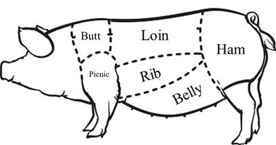 On average this is what you would receive for a half hog: 14lbs of pork chops or loin roast, 3lbs of ribs, 12lbs of shoulder roasts or steaks, 2 hocks (fresh or smoked), 10lbs of ground pork or sausage (if you grind other cuts amount will increase), 18lbs of ham (half, whole or steaks), 10 lbs of bacon or fresh belly. Also, you can request liver and heart.